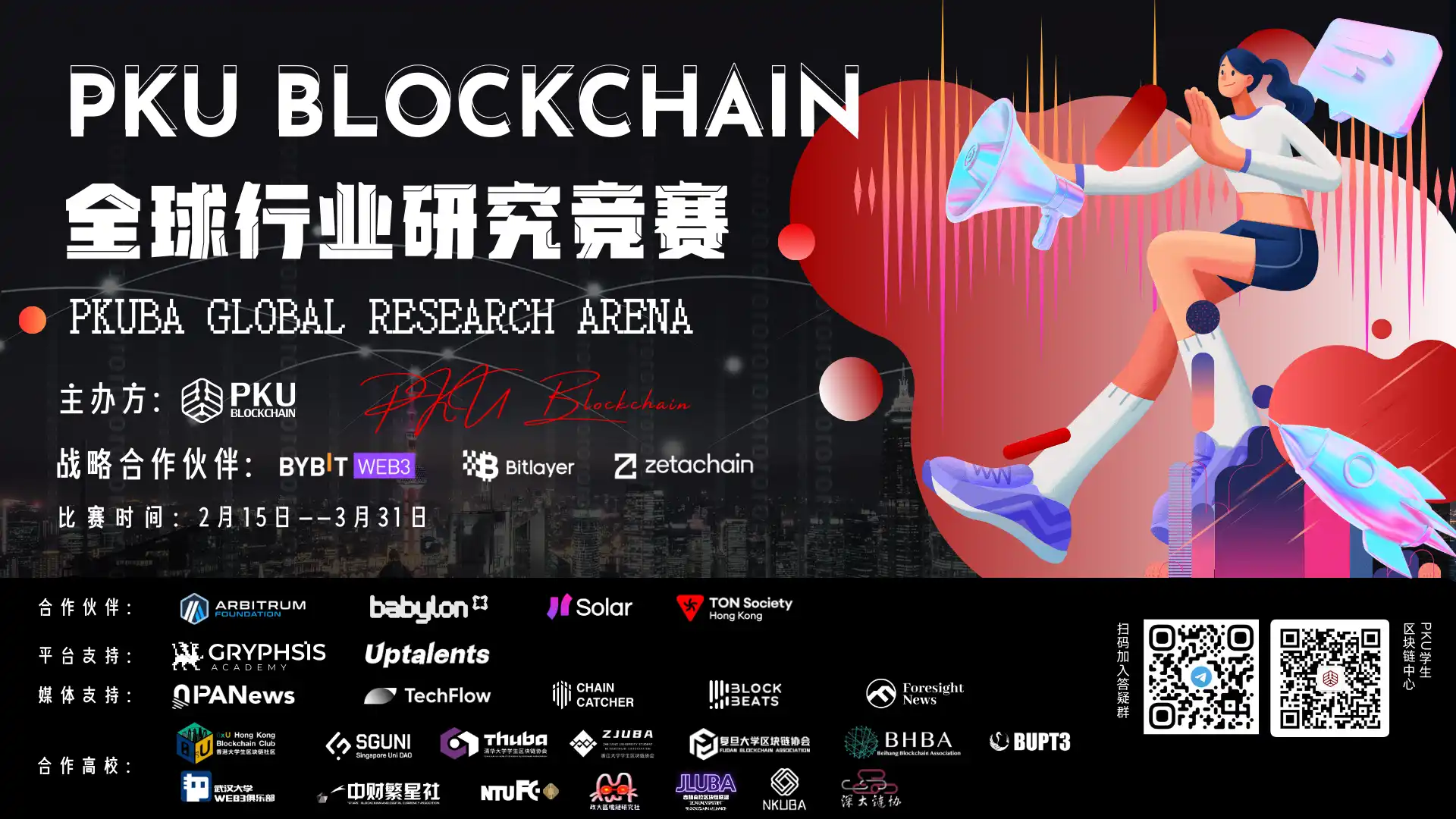PKU Blockchain 将携手战略合作伙伴 Bybit Web3、Bitlayer、ZetaChain,联合 Arbitrum、Babylon、 Solar、Ton 等业内顶级机构,平台支持方 Gryphsis Academy、Uptalent 以及 0xU(香港大学、香港中文大学、香港科技大学、香港城市大学、香港理工大学)、SGUni(新加坡国立大学、南洋理工大学、新加坡管理大学)、清华大学、浙江大学、复旦大学、北京航空航天大学、北京邮电大学、中央财经大学等 10 余所国际顶尖高校链协,为各位 Web3er 提供提升行研能力和自我展示的平台,建立长期、活跃、高质量的 Web3 研究员社区。