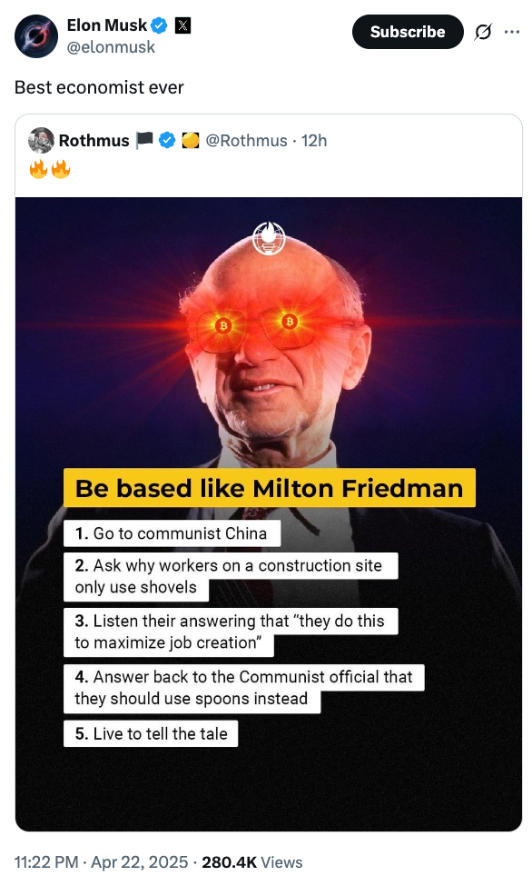 快链头条 消息,马斯克转发 @Rothmus 发布的带有比特币激光眼图片的推文,并针对图片上关于经济学家米尔顿·弗里德曼的故事配文「史上最佳经济学家」。