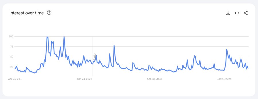 快链头条 消息,Bitwise 首席执行官 Hunter Horsley 发文称,比特币价格已达 9.4 万美元,然而谷歌上「比特币」的搜索量却接近长期低点。表明当前市场并非由散户投资者驱动。机构、投资顾问、企业及国家主体已纷纷入场。购买比特币的投资者类型正在不断多元化。
