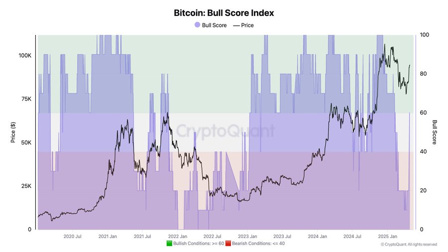 CryptoQuant 分析师:比特币牛市指数达到 60,表明市场乐观情绪重新燃起